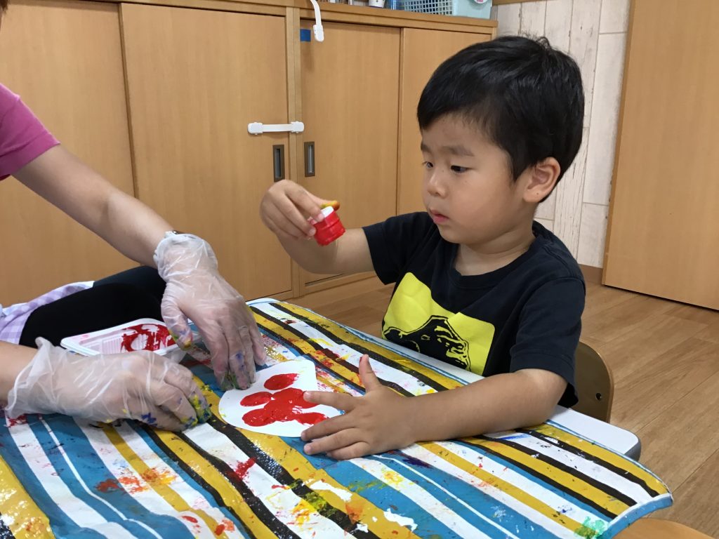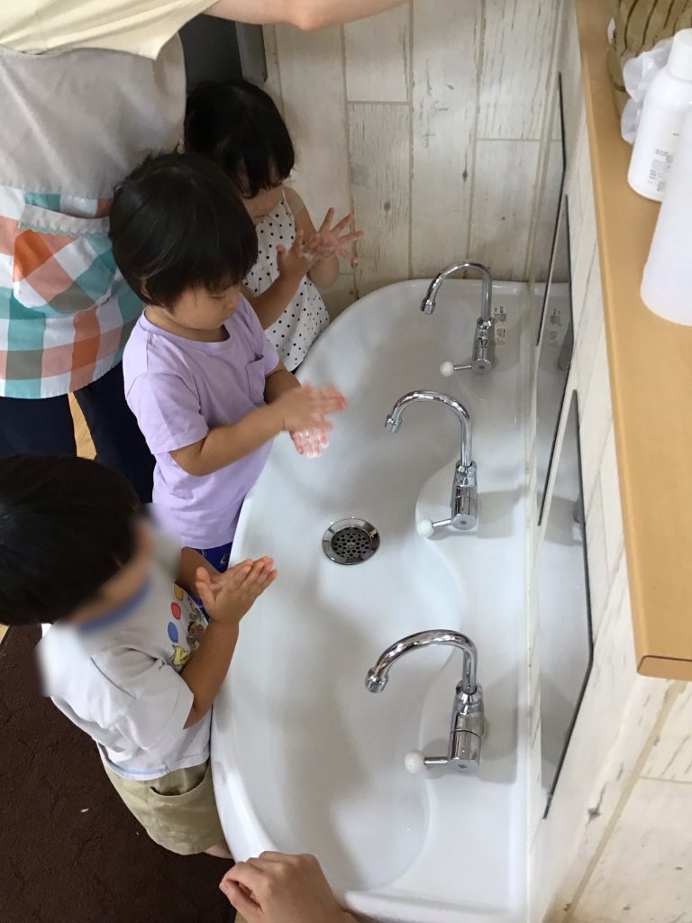 看護師のA先生が、ばい菌のお話しをしてくれたり、「♪おねがいカメさん♪」の歌に合わせて手を上手に洗う練習もしたよ! 手にバイキンスタンプを押してもらって、石鹸でキレイに洗ったんだ!もうピッカピカだよ!