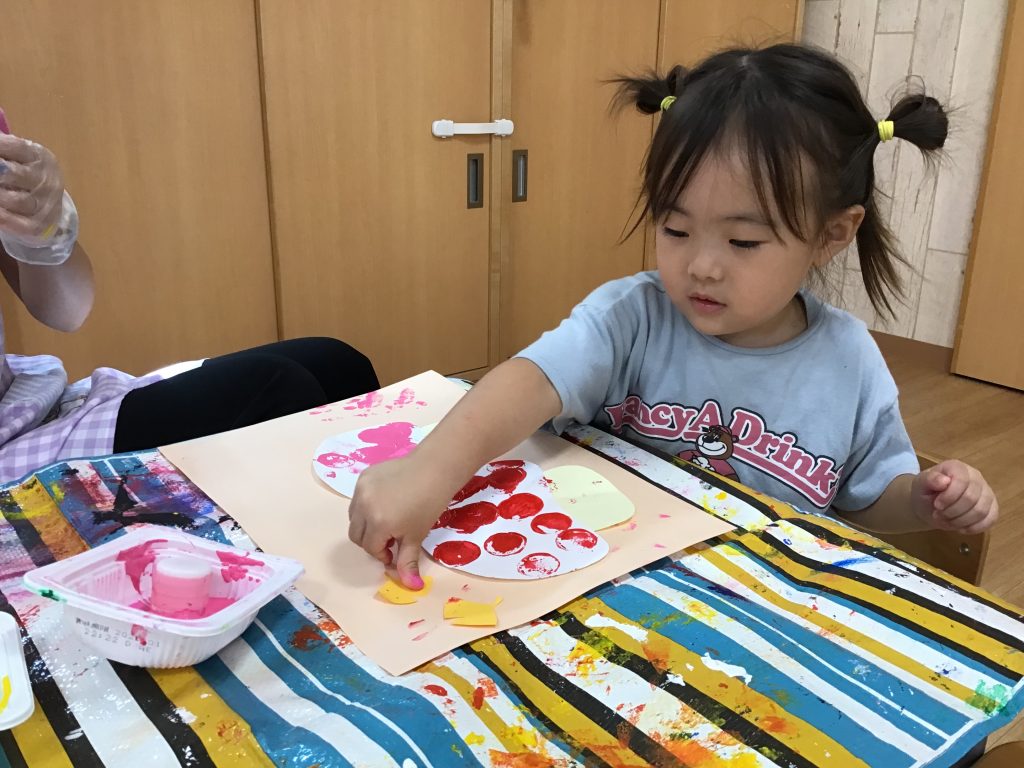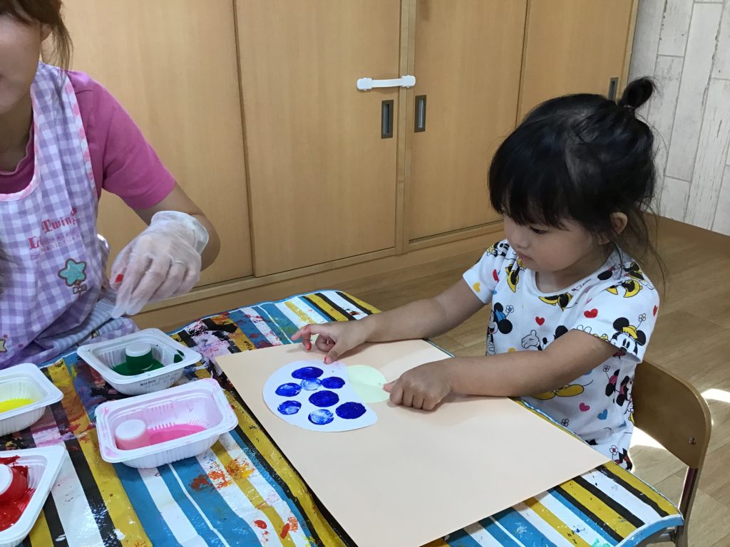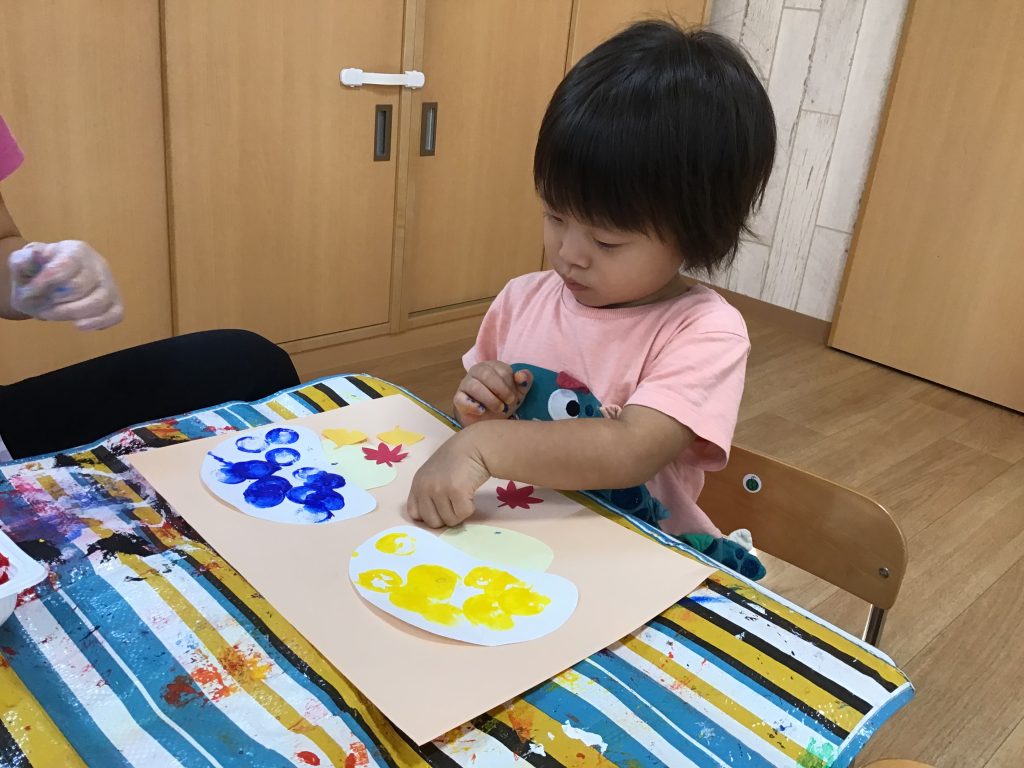 🐣ひよこ組(0歳児)『お月見』~お花紙をにぎにぎして満月を。ポンポンとたんぽで真っ暗な秋の空を表現しました!
