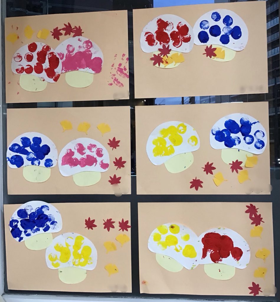 🐰うさぎ組(2歳児)『きのこ』~きのこの模様はペットボトルの蓋を利用してえのぐでスタンピング。周りに落ち葉を飾って出来上がり~!