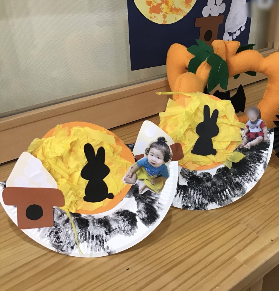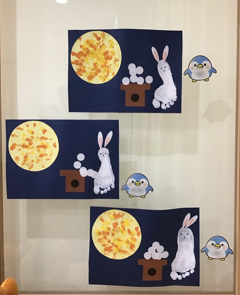 🐧ぺんぎん組(1歳児)『お月見」』~満月はえのぐを使って指でスタンピング。うさぎは足形で作りました。最後におだんごをペタペタ飾って出来上がり~!