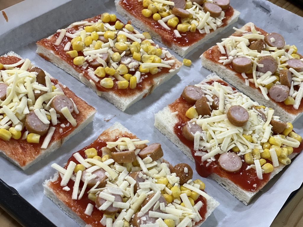 食パンにピザソースを塗って…ソーセージとコーンとチーズをのせて…給食の先生に美味しく焼いてもらったよ!!! 給食と一緒に出してもらって、みんなモリモリ食べたよ! やっぱり手作り 最強!!!