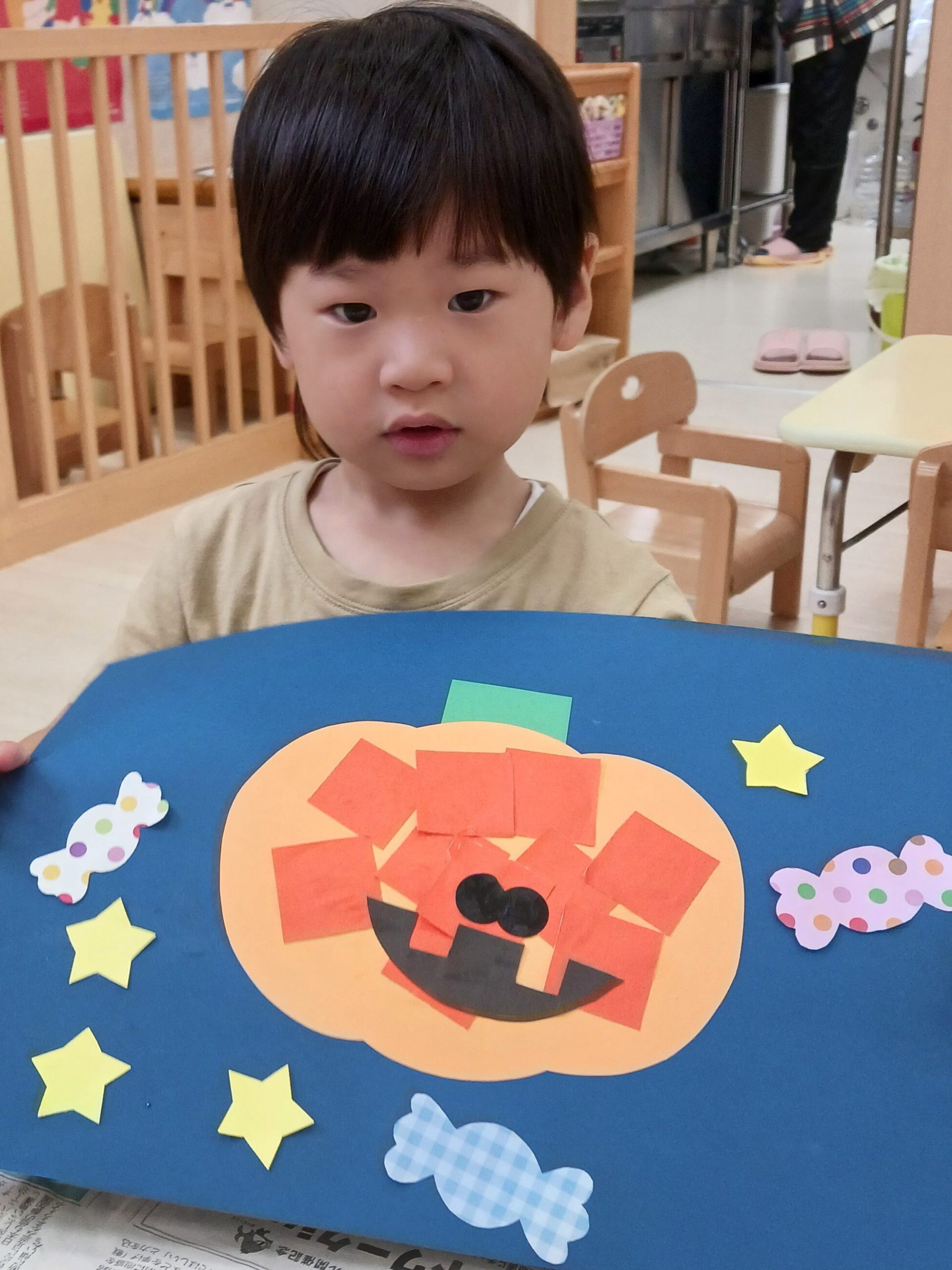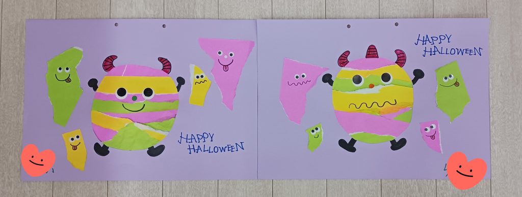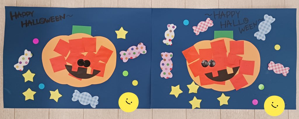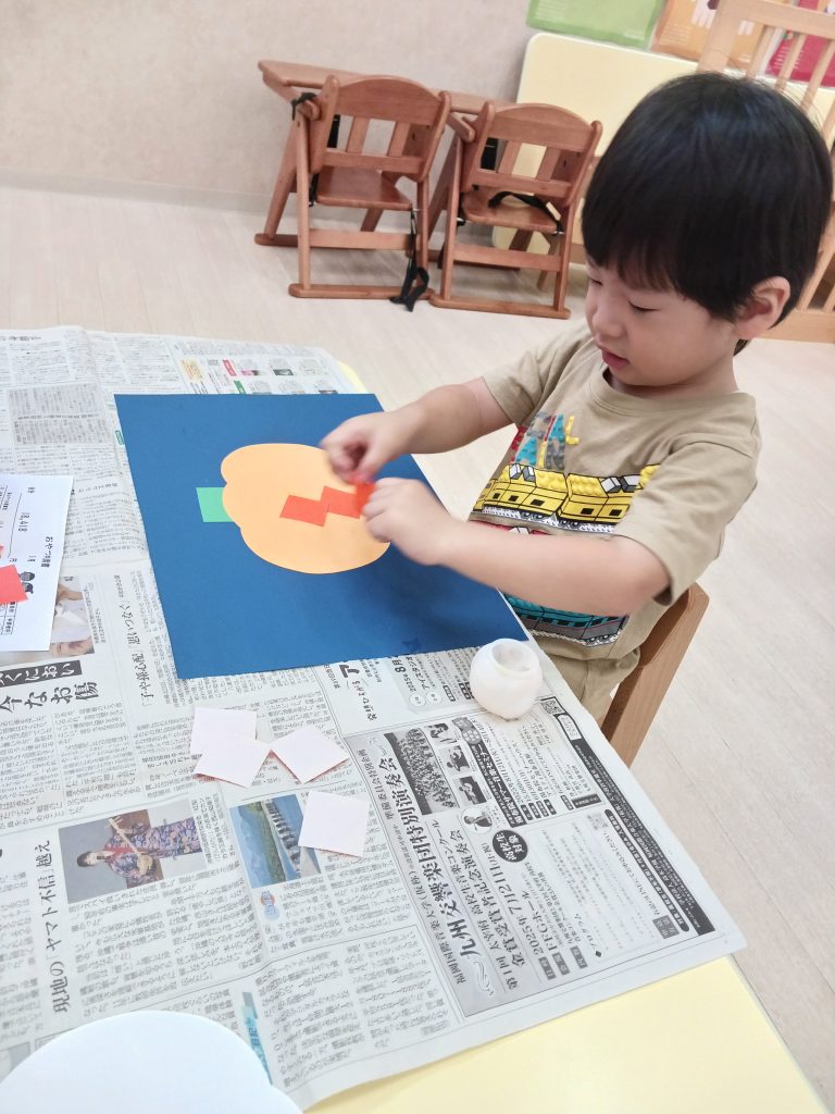うさぎ組 🎃ハロウィンかぼちゃにペタペタのりで貼りました‼