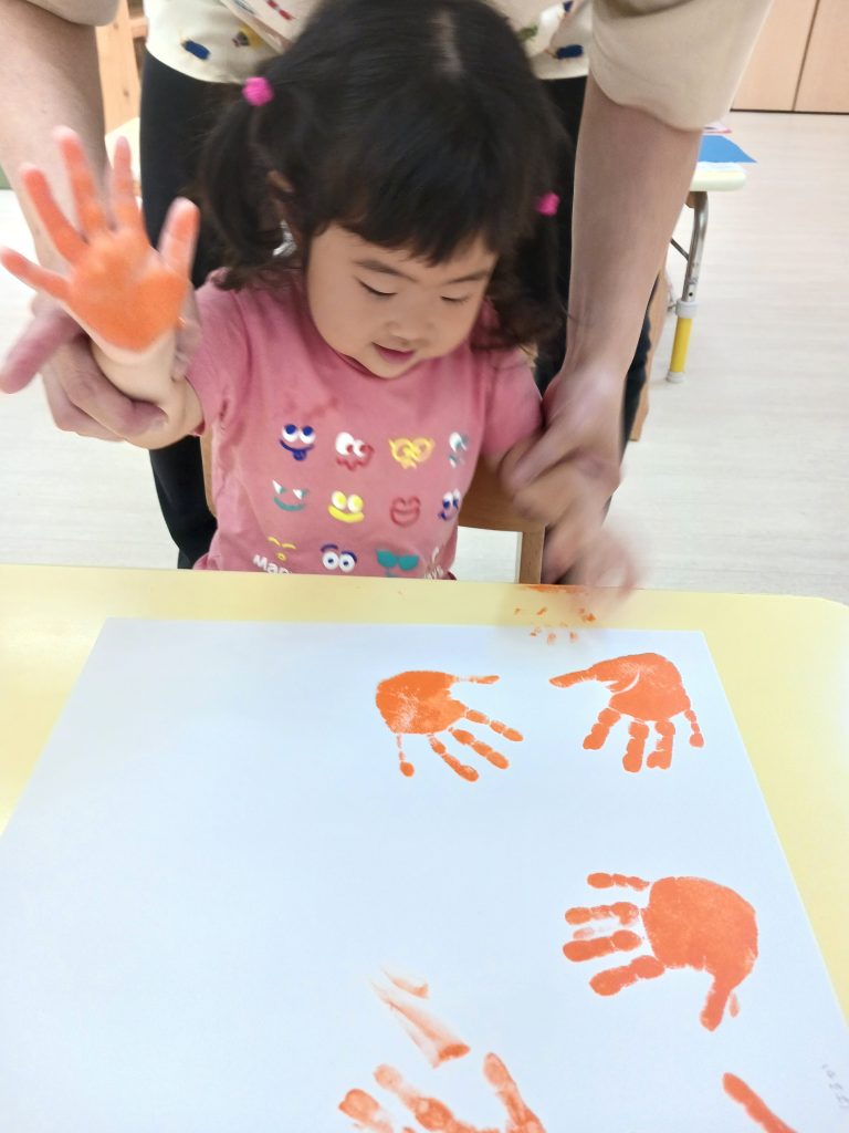 りす組 手形をペタペタ、目・口をのりで貼りました。