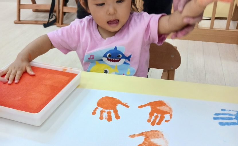 りす組 手形をペタペタ、目・口をのりで貼りました。