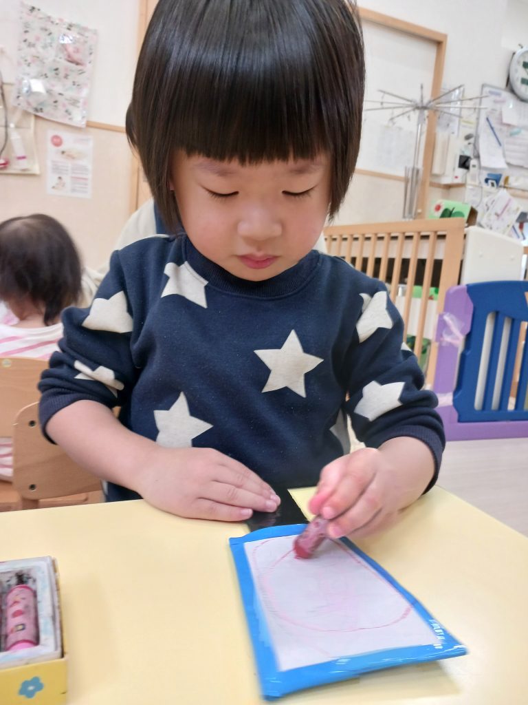 羽根つきは、羽子板にクレヨンで絵を描きました。