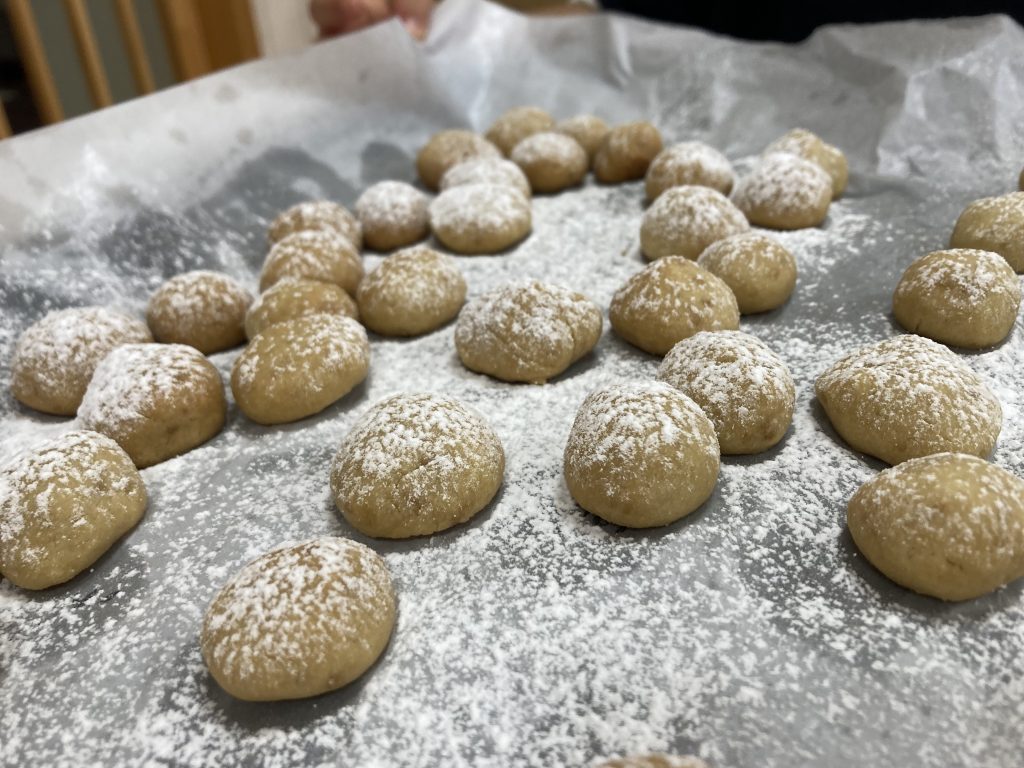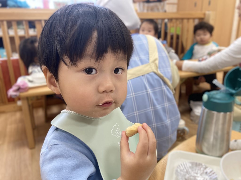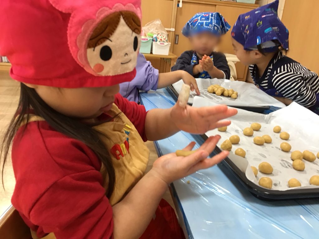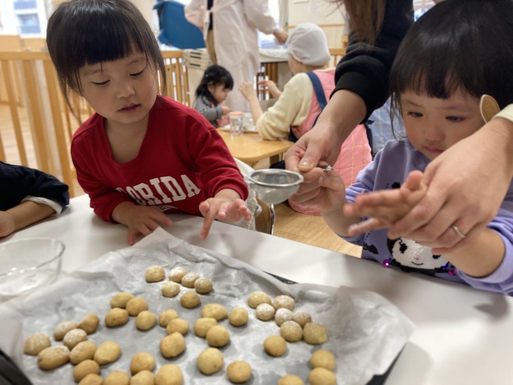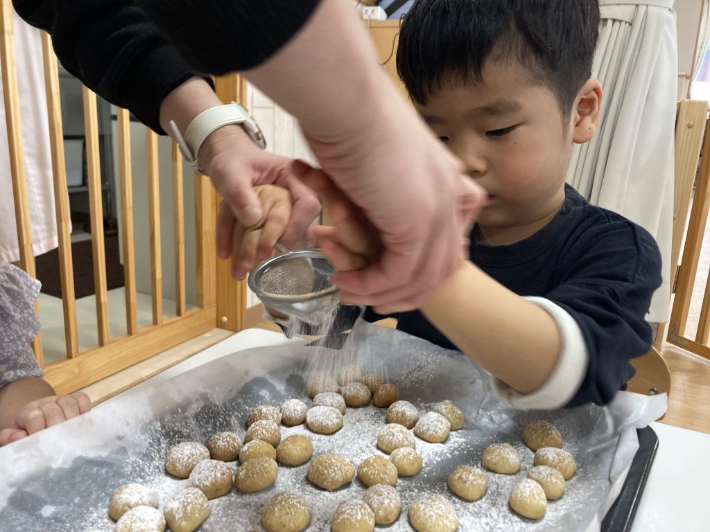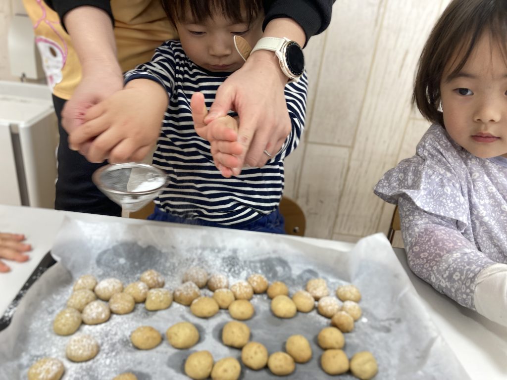 今月のクッキング(食育)は「クッキー」! みんなでせっせせっせと頑張って60個丸めたよ! いい匂いがして焼けたら、白いお砂糖をパラパラ~! 給食のデザートで、ひよこ(0歳児)さん、ぺんぎん(1歳児)さんも一緒にいただきま~す!